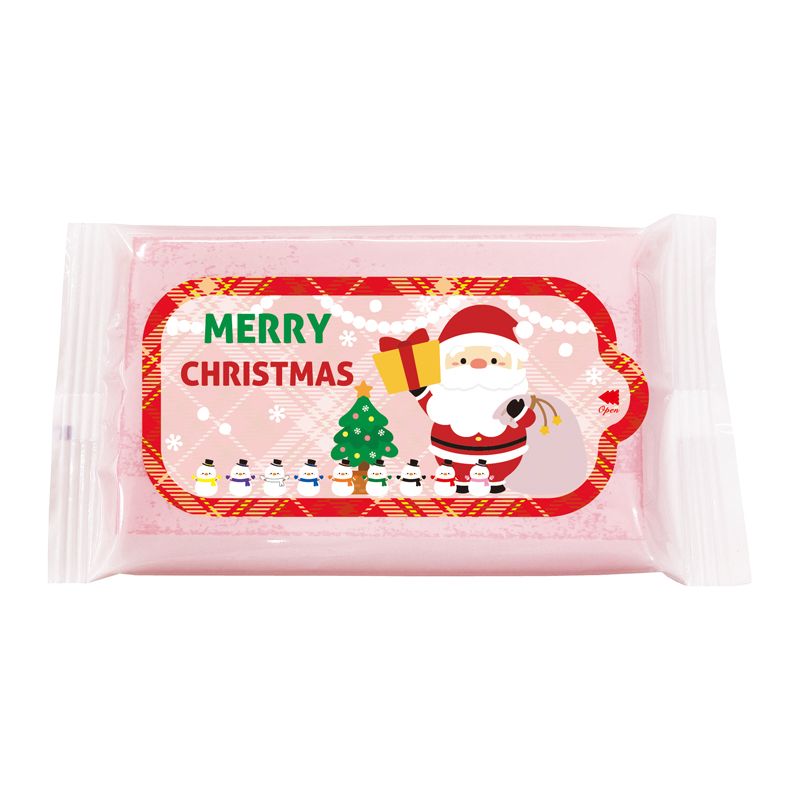 あると安心の衛生アイテムをクリスマス仕様に。サンタのパッケージの中は赤いウェットティッシュ!