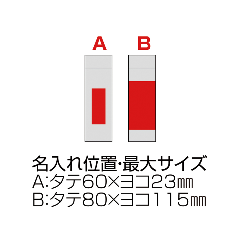 | 名入れ位置・版代 | A:タテ60×ヨコ23mm 版代P・プリント代E B:タテ80×ヨコ115mm 版代S(回転)・プリント代 回転 |