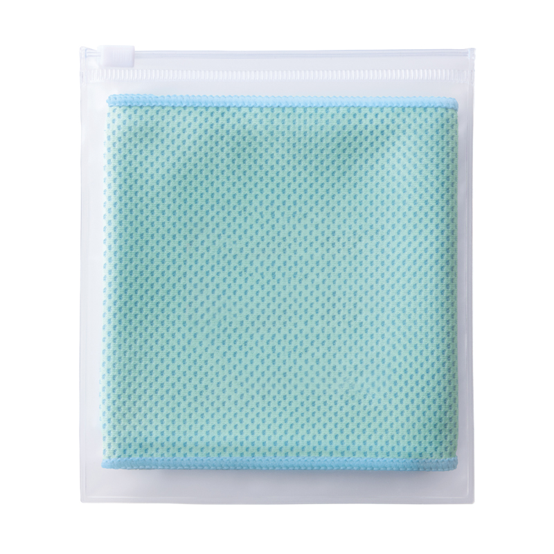濡らして絞るだけでひんやり冷たい、携帯に便利なポーチ付きの涼感タオルです。