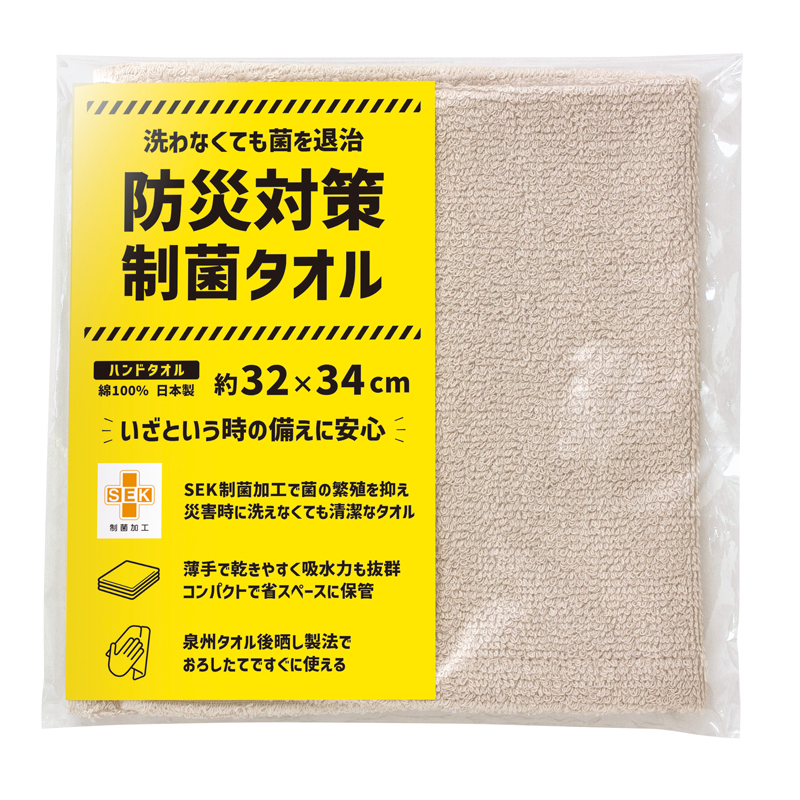 制菌加工を施したタオルなので、衛生面が気になる避難時なども安心です。薄手なので扱いやすいのも◎。