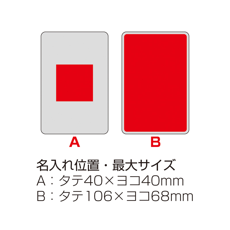 | 名入れ位置・版代 | A:タテ40×ヨコ40mm 版代P・プリント代E B:タテ106×ヨコ68mm フルカラープリント |