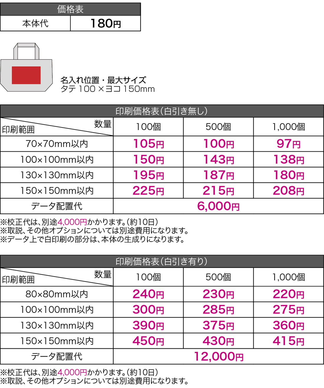 | 名入れ位置・版代 | タテ100×ヨコ150mm |