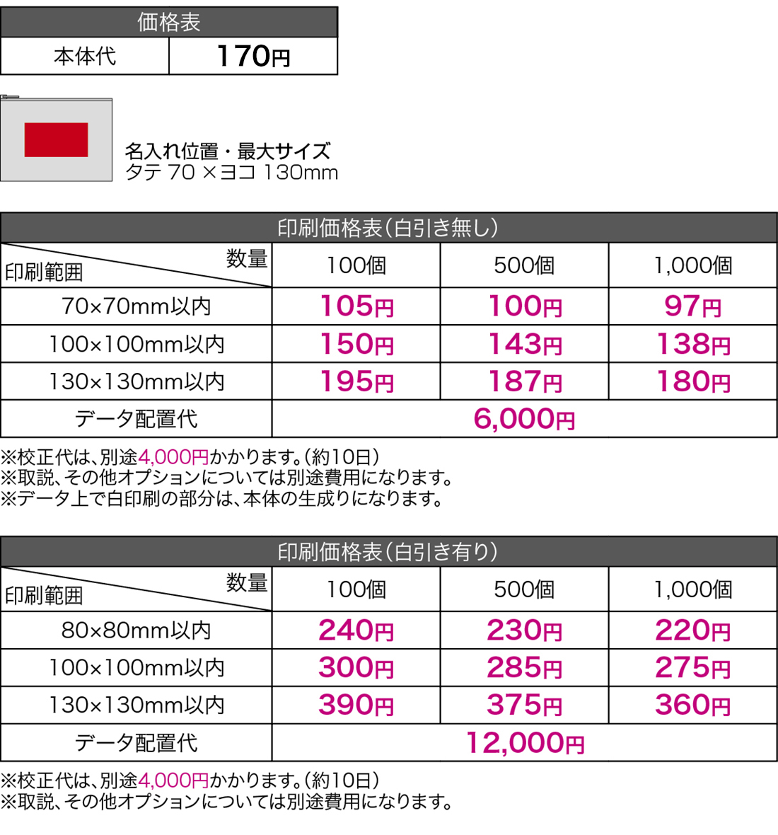 | 名入れ位置・版代 | タテ70×ヨコ130mm |