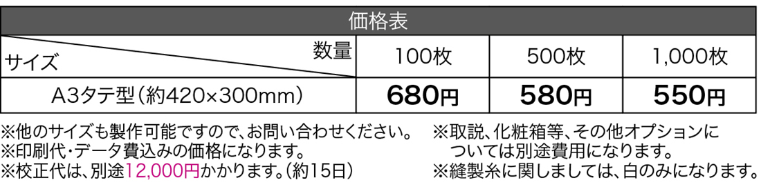 | 名入れ位置・版代 | A3タテ型(約420×300mm) フルカラープリント |