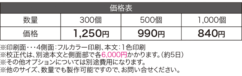 | 名入れ位置・版代 | 4側面 本文/1色印刷 |