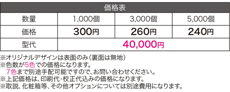 | 名入れ位置・版代 | 全面対応可能 フルカラー |