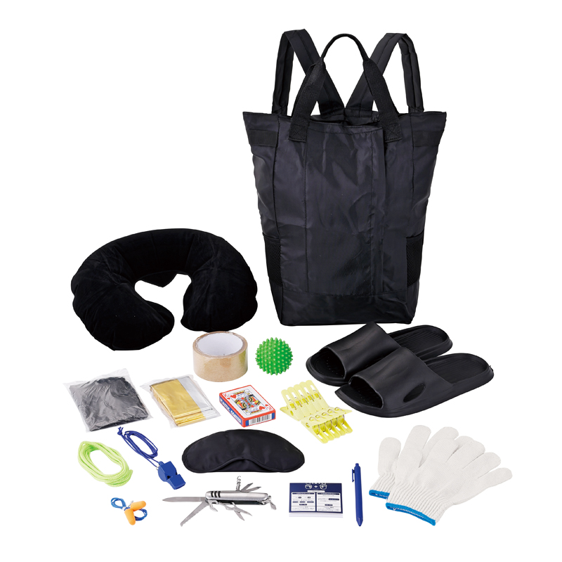 備考 | 名入れ可能 セット内容:2WAYリュック、エアネックピロー、ガムテープ、リラックスボール、スリッパ、レインコート、アルミブランケット、トランプ、ロープ、洗濯ばさみ10P、軍手、アイマスク、ボールペン、防災メモ、耳栓、ホイッスル、多機能ナイフ ※商品のセット内容、パッケージのデザインが変更になる場合がございます。 |