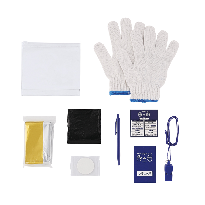備考 | 名入れ可能 セット内容:軍手、アルミブランケット、ホイッスル、ゴミ袋(3枚)、防災の心得帳、ボールペン、メモ帳、圧縮タオル、ポーチ ※商品のセット内容、パッケージのデザインが変更になる場合がございます。 |