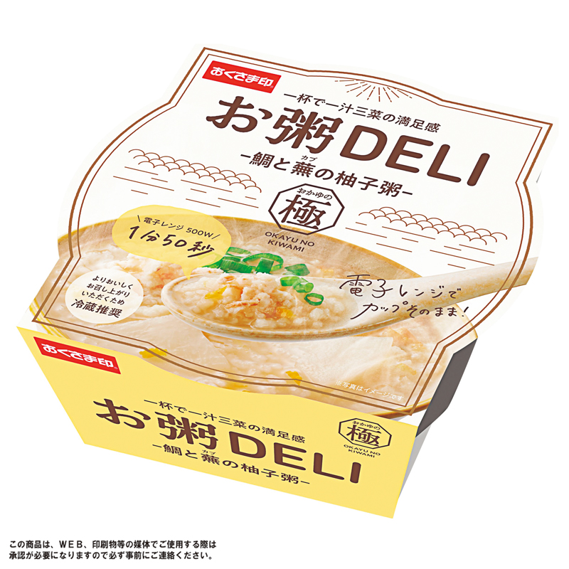 鰹と昆布の優しい出汁が、鯛の食感と風味を引き立て、アクセントの柚子でさっぱりしたお粥です。99kcalと低カロリー。