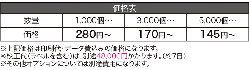 | 梱包状態 | 個別フィルム包み 両面ラベル貼り(4c/スミ1c) |