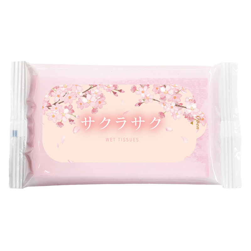 上品なパッケージと桜色が印象的なウェットティッシュ。バッグに入れてもかさばりにくいハンディタイプ。